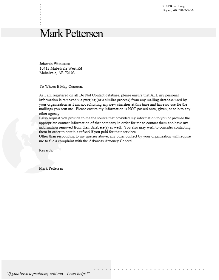 Are you constantly being harassed with unsolicited mailings from the Jehovah Witnesses at 10412 Mabelvale West Rd Mabelvale, AR 72103? Then read below!