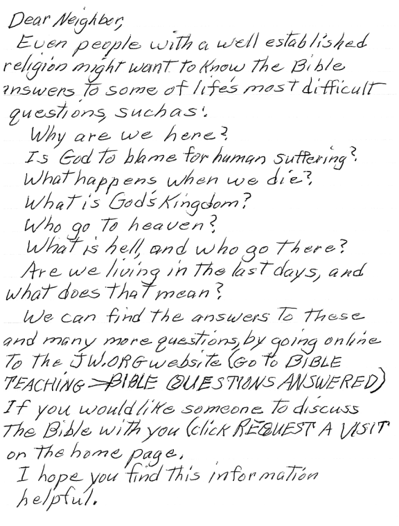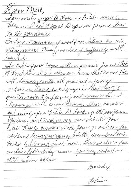 | Initial mailing from the Southwest Little Rock Congregation of Jehovah's Witnesses, 2021-01-11 | Original letter: