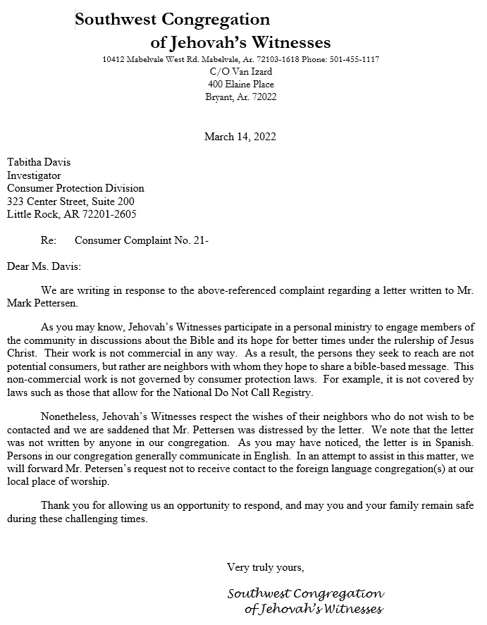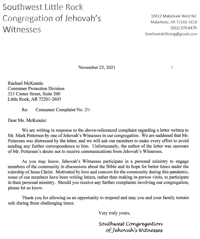 | Second response from the Southwest Little Rock Congregation of Jehovah's Witnesses |