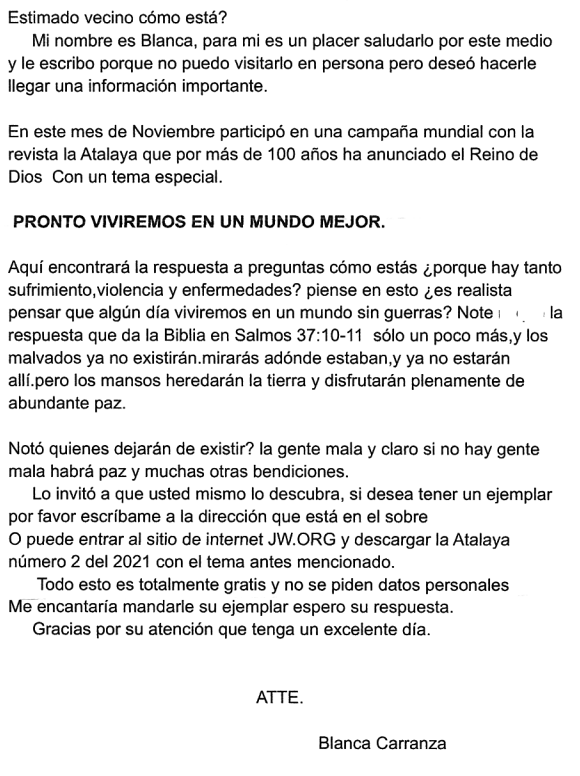 | Fifth mailing from the Southwest Little Rock Congregation of Jehovah's Witnesses, 2022-02-28 | Original letter, again in Spanish: